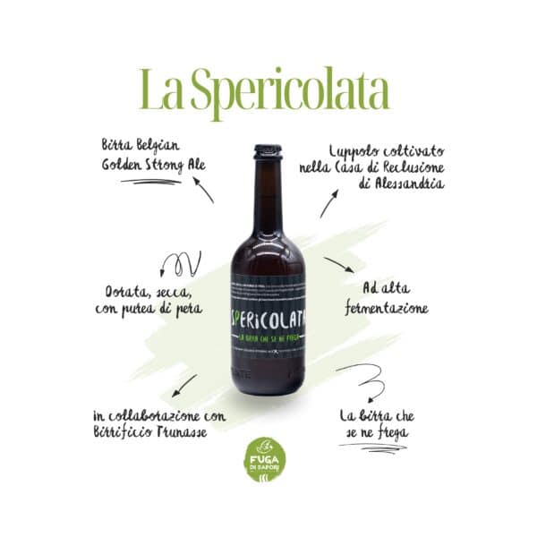 La Spericolata nasce dalla collaborazione tra Fuga di Sapori® e Birrificio Trunasse, utilizzando il luppolo coltivato dai detenuti della Casa di Reclusione di Alessandria.